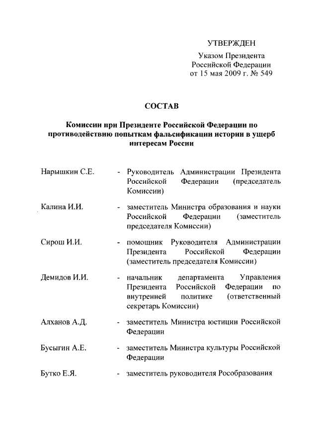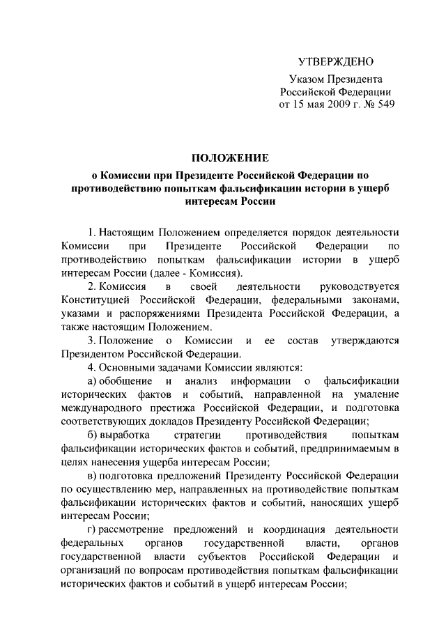 В целях обеспечения согласованной деятельности федеральных органов государственной власти, органов государственной власти субъектов Российской Федерации и организаций, направленной на противодействие попыткам фальсификации истории в ущерб интересам России, постановляю: 1. Образовать Комиссию при Президенте Российской Федерации по противодействию попыткам фальсификации истории в ущерб интересам России. 2. Утвердить прилагаемые: положение о Комиссии при Президенте Российской Федерации по противодействию попыткам фальсификации истории в ущерб интересам России; состав Комиссии при Президенте Российской Федерации по противодействию попыткам фальсификации истории в ущерб интересам России. 3. Настоящий Указ вступает в силу со дня его подписания.
