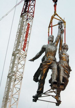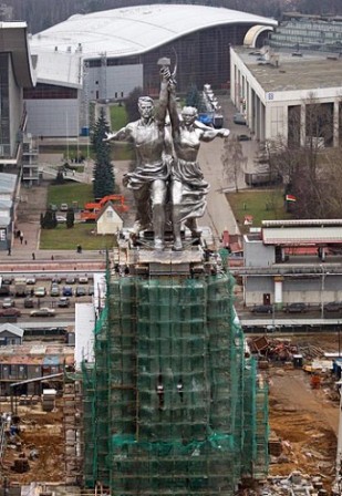 Москве вернули статую Рабочего и Колхозницы. Статуе работы Веры Мухиной семьдесят два года спустя вернули первоначальный постамент – павильон работы Бориса Иофана. Стоя на таком же, она явилась миру на международной выставке в Париже в 1937 г. В павильоне разместились музей статуи, а также, как теперь полагается, торговый комплекс и подземный гараж. Фасад павильона украшен гербом Советского Союза образца 1936 г. – с надписью «Пролетарии всех стран, соединяйтесь!» на языках одиннадцати союзных республик.